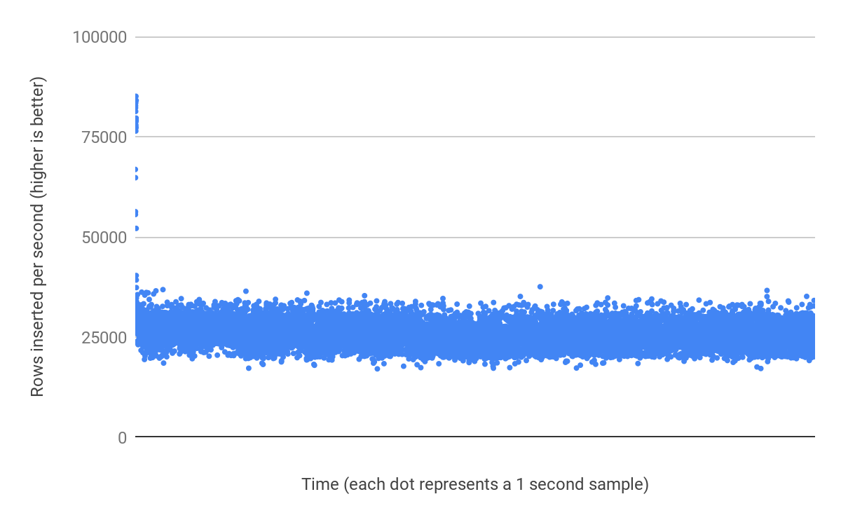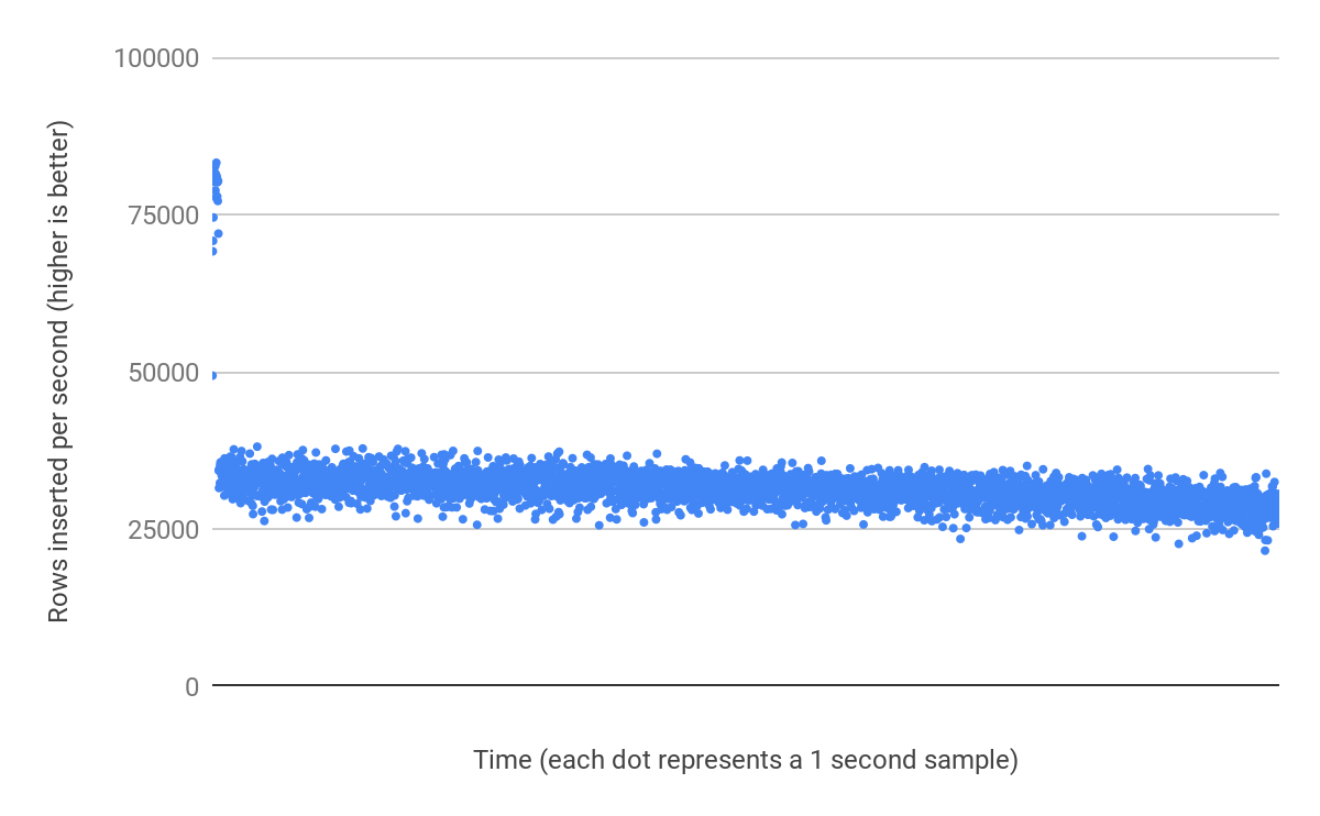 .. they look almost identical right? Lets try and insert rows into them in 32 parallel threads for one hour: